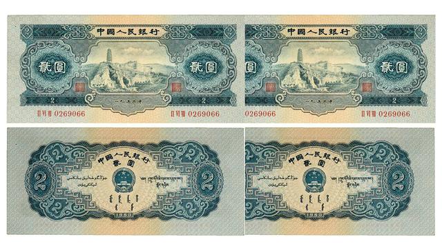 第二套人民币1953年2元纸币正面采用双凹印刷,这是我国传统手工雕刻的方法制作而成的,具有浓烈的中华民族气息,在纸币票面的正面是发宝塔山图像,修建于唐代的宝塔共九层,在塔顶可以看到整个城镇的风景,这座宝塔坐落于延安,是我国中国革命军的象征,变现出了我国共产党领导的革命军的伟大与气势磅礴,在纸币的反面图片是中华民族共和国国徽和用汉族,蒙古族,藏族,维吾尔族四族文字写的"中国人民银行贰元"。这种纸币墨层厚,所以具有比较好的防伪功能。