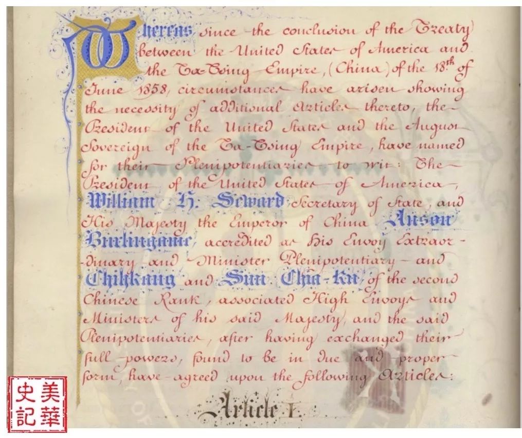 条约的全称是《中美天津条约续增条约》,史称《蒲安臣条约》。条约签于1868年7月28日,一年多后清政府签于1869年11月23日。条约是蒲安臣在华盛顿和国务卿西华德签署的。没有任何相关的笔记和文件存留,似乎这个条约只是蒲安臣和西华德谈话的产物。多年后,在西华德的儿子Frederick W. Seward的信里可以看出一些原委。当时美国总统Andrew Johnson刚刚经历国会乃至全国的疯狂弹劾,美国与中国《蒲安臣条约》、和俄国的《阿拉斯加易手条约》都至关重要,但两者都没有在正常的外交途径中产生,因为情况特殊,任何反对都是致命的。条款只好在国务卿和外国公使之间商讨,总统最后签署条约[64]。