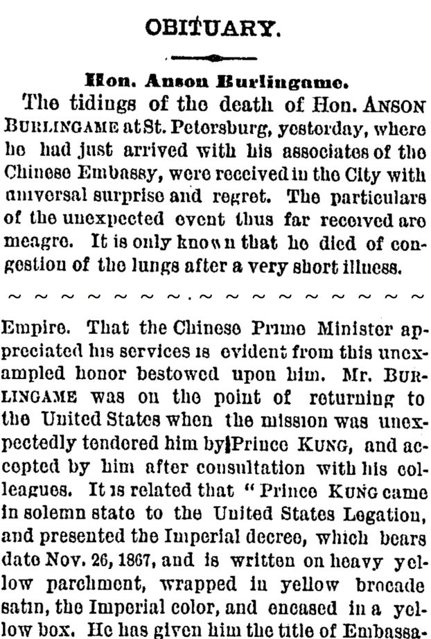 图13(左)蒲安臣病逝在1870年2月24日《纽约时报》的讣告
