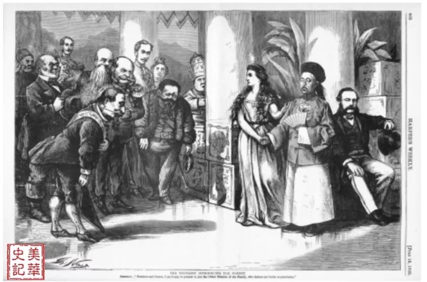 图17 美国把中国带给世界“The Youngest Introducing the Oldest” 18 July, 1868 by Thomas Nast for Harper’s Weekly. Source: UDel-Walfred