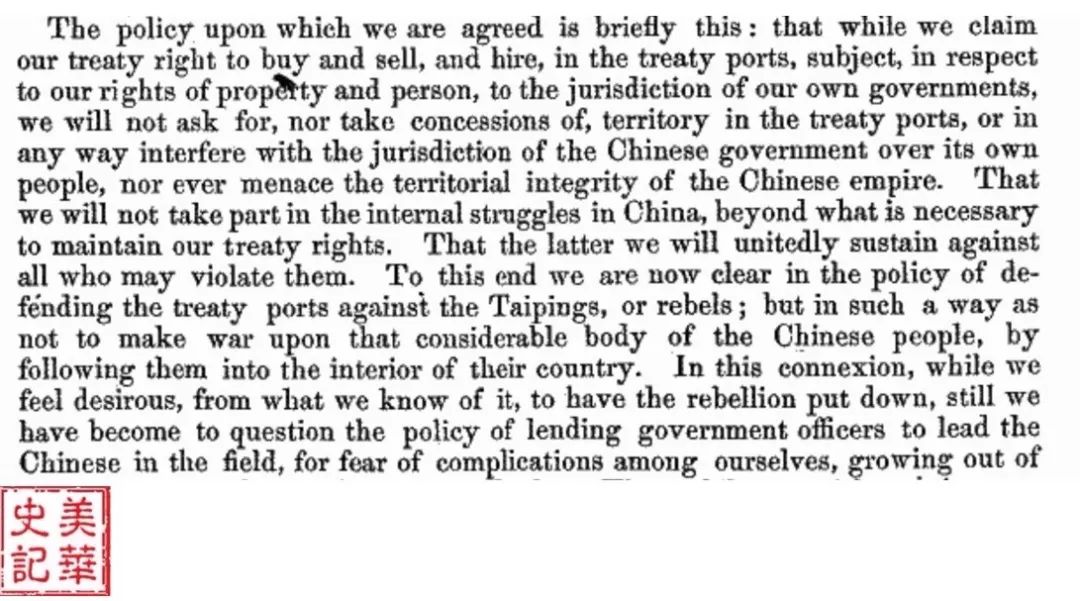 蒲安臣是“合作政策”坚定执行者和完善者,不是他必须这么做,毕竟(和国务卿)四到六个月通信时间差足以让他有绝对的自主权,而是因为蒲安臣和西华德对华的政策观点并无二致。[21]在蒲安臣和西华德之间长达六年的通信中,清晰地印证了蒲安臣的观点。蒲安臣在1863年6月20日写给西华德一封长信道:“在保证美国条约权利的情况下,美国既不要求,也不占用租界;不干涉中国内政;不威胁中国的领土完整”[22]。(见图5)无论是遇到各种障碍还是各方指责,亦或是霸凌中国的诱惑,蒲安臣的态度始终如一。[23]魏斐列(Frederick Wells Williams )【注解5】在他专门研究蒲安臣的著作《蒲安臣和中国的第一次外交出使》一书中说:“在(蒲安臣担任驻华公使)这段时间,他没有从大洋的另一侧带来一兵一卒,他能控制局面完全出自他非同寻常的坚定信念”[24]。正因此,蒲安臣代表的美国从没有向清政府提出割让土地的要求。