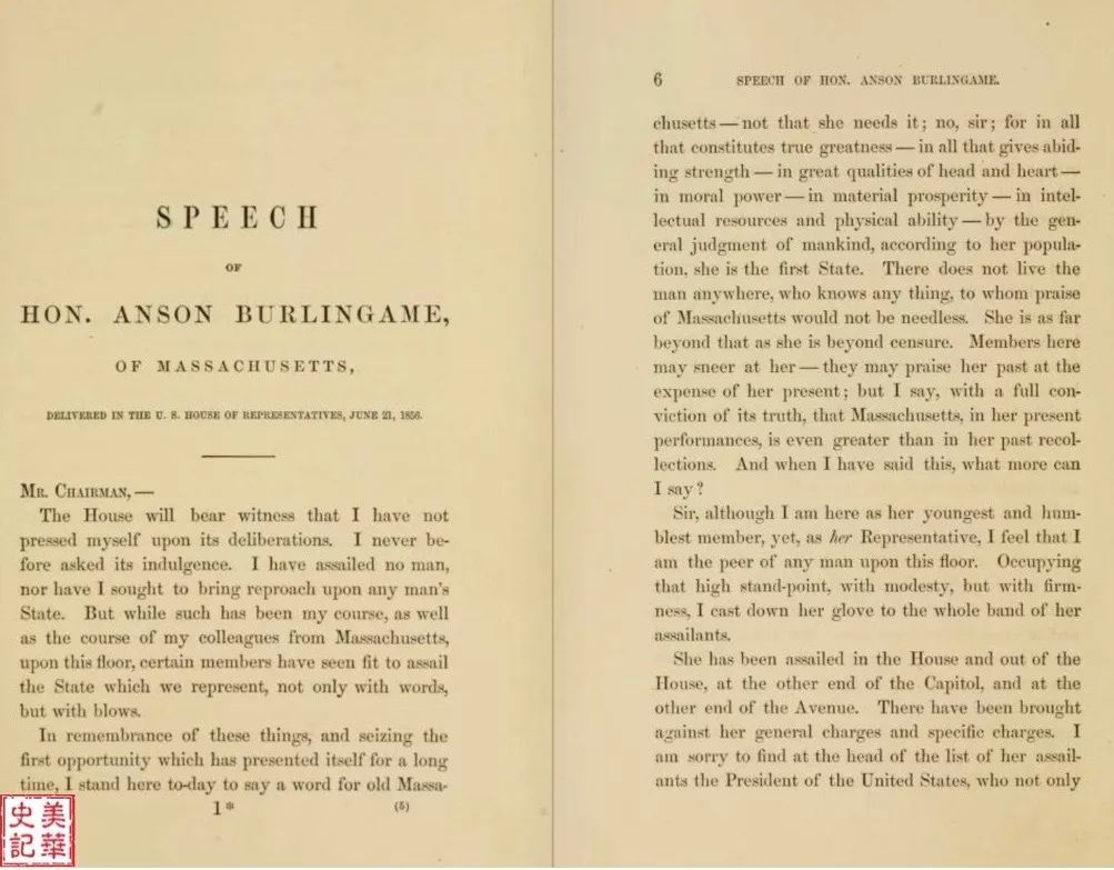 图片3. 蒲安臣在国会的著名反奴隶制演讲《马萨诸塞州的抗辩》。https://archive.org/details/defenceofmassach00burl