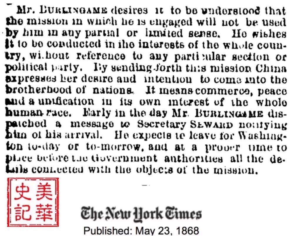 图11 纽约时报1868年5月23日对蒲安臣使团初到美国的报道