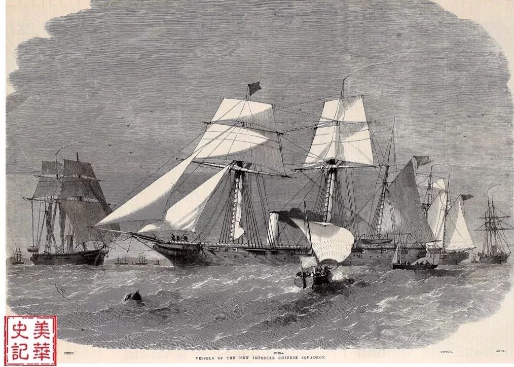 2. 阿思本舰队 (Lay-Osborn Flotilla) 。1862年1月清政府从英国购买来的6艘军舰、2艘供应船,用以镇压太平天国运动(见图六)。1863年舰队到了天津却成了英国人李泰国【注解7】的私有舰队,根本不听清政府的指挥。李泰国要求清政府接受他和阿斯本(舰队司令)签订的合同“十三条协议“。舰队成了英国控制中国兵权的 “英中联合舰队” ,也成了中国内部权贵角力的重要砝码。1863年11月7日在给西华德的公文中,蒲安臣说他遇到了他来中国以后最困难的问题[30]。蒲安臣很早就注意到这只舰队的动向,他向恭亲王咨询过此事,在给美国的公文中也报告过此事。当清政府拒绝签协定否认舰队的合法性时,蒲安臣敏锐地觉察到舰队去向的危险:日本的大名、沿海的海盗和美国的南方军都在觊觎军舰。蒲安臣写到:“事实是,舰队不符合中国人的需要,其中一艘是世界上最快的,所有舰船都比其他同类先进...我很奇怪清政府为什么没有立刻拒绝协议”[31]。最后清政府按蒲安臣的建议,拍卖船只,解散舰队,支付巨额遣散费[32] ,结束了靠外国人建立海防的梦想。清政府为此白白消耗了67万两白银[33] 。英国人赫德(Robert Hart)【注解8】取代李泰国成为中国海关总税务司长达48年之久。