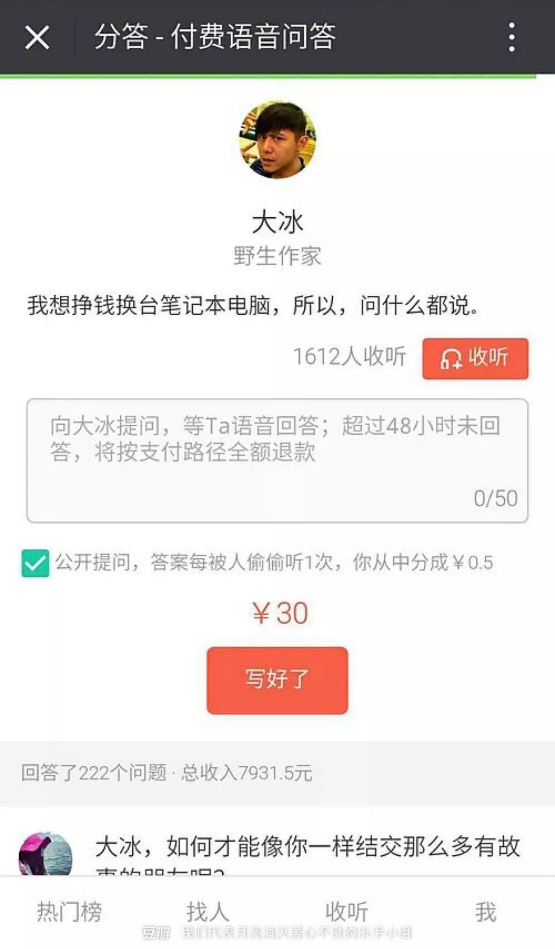 16年分答APP正流行的时候,大冰在分答简介里写到「我想挣钱换台笔记本电脑,所以,问什么都说。 」