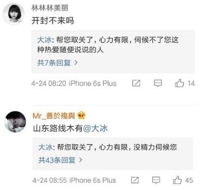 另一方面,粉丝稍稍提出一点质疑,大冰就瞬间黑脸,把无辜粉丝打入冷宫。
