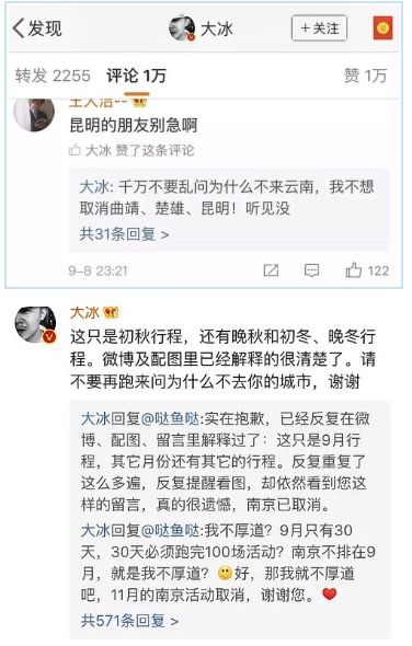 而且如果粉丝在评论下方询问是否去XX城市,大冰一般会直接取消该城市的行程。