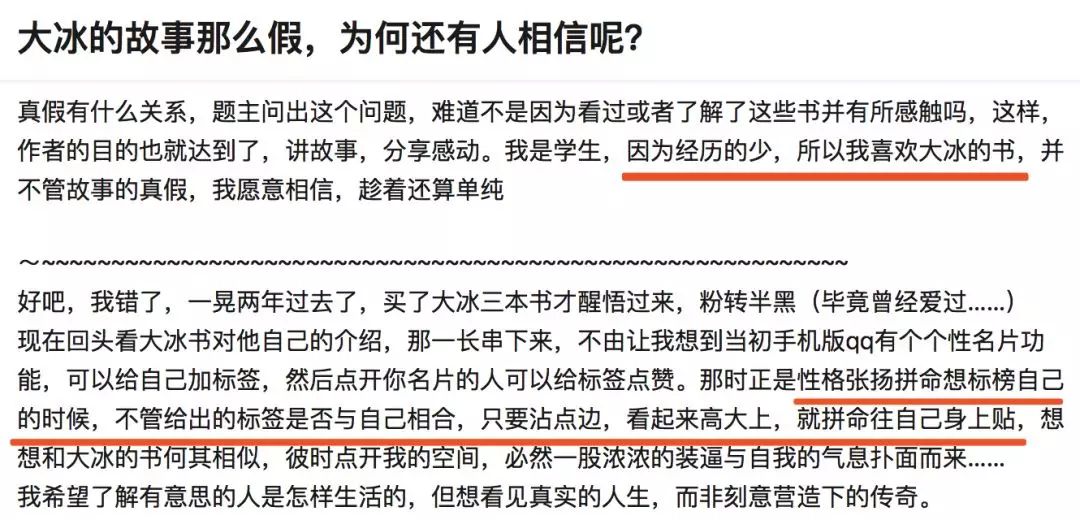 在某社区上有一个学生说,曾经经历的少,所以大冰的书不论真假,他全信。