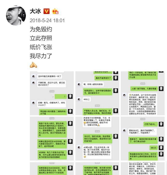 6月5号,大冰发微博称新书《小孩》要上市了,他将自己和编辑的对话截图晒了出来。