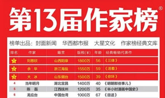 在今年4月公布的第13届作家榜名单中,他更是以1500万的版税位列第三,排在他前面的第一、第二名分别是刘慈欣和余华。
