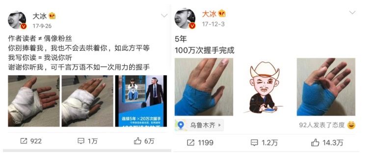 一方面,大冰告诉族人粉丝们,我要握遍你们每个人的手,给你们温暖。