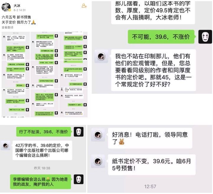 编辑则不依不饶,各种「诱惑」大冰,定价一定要40以上。几番周旋后,新书的最终成交价定在了39.6元。