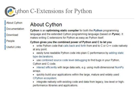 优化的Python静态编译器,使用类型混合使Python编译成C或C++模块来获得性能的极大提升,使为Python编写C扩展与Python本身一样容易。