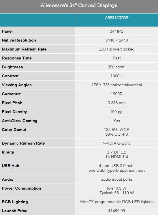 【天极网DIY硬件频道】戴尔旗下游戏品牌外星人(Alienware)推出34英寸曲面屏显示器新品AW3420DW,采用3440×1440分辨率的“Nano Color”IPS面板,支持120Hz G-Sync自适应刷新率,覆盖98%的DCI-P3和134.5%的sRGB色域,1900R曲率、水平/垂直视角均为178°,屏幕最高亮度350 its、对比度 1000:1。
