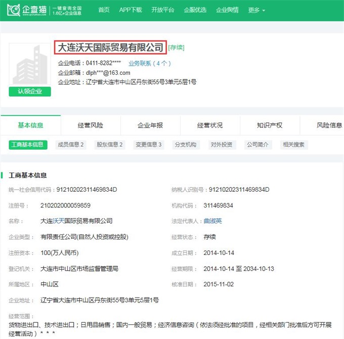 企查猫资料显示,大连沃天国际贸易有限公司成立于2014年10月14日,注册资本100万人民币,主要从事货物进出口、技术进出口;日用品销售;国内一般贸易;经济信息咨询等。