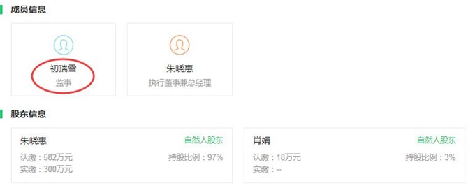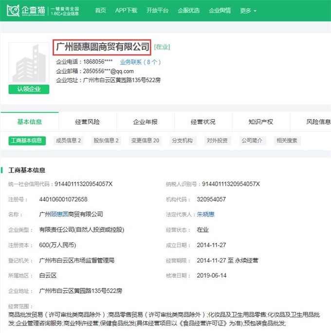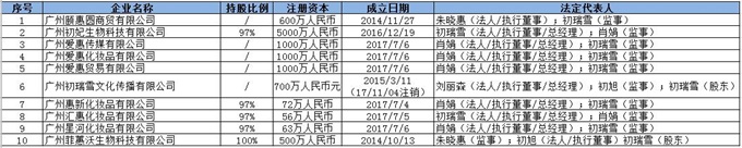 企查猫资料显示,初瑞雪在广州初妃生物科技有限公司、广州汇惠化妆品有限公司、广州颐惠圆商贸有限公司、广州巴伽娱乐传媒有限公司、广州爱惠传媒有限公司、广州爱惠化妆品有限公司、广州惠星文化传媒有限公司、广州初瑞雪文化传播有限公司、广州星河化妆品有限公司、广州菲蕙沃生物科技有限公司等担任法人或股东、高管。