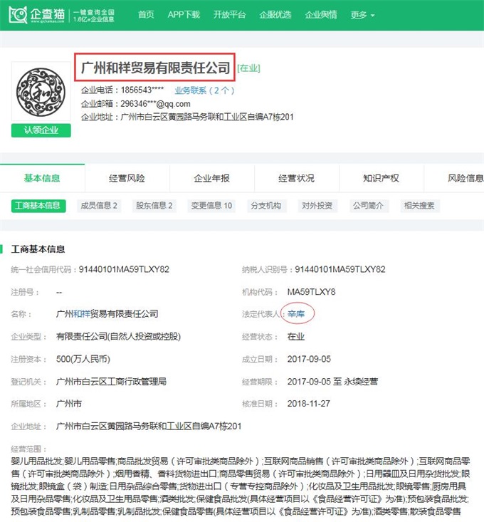 广州和祥贸易有限责任公司成立于2017年9月5日,注册资本500万人民币,经营范围主要包括:婴儿用品批发;婴儿用品零售;商品批发贸易(许可审批类商品除外);互联网商品销售(许可审批类商品除外);互联网商品零售(许可审批类商品除外);烟用香精、香料货物进出口;商品零售贸易(许可审批类商品除外);日用器皿及日用杂货批发;眼镜批发等。
