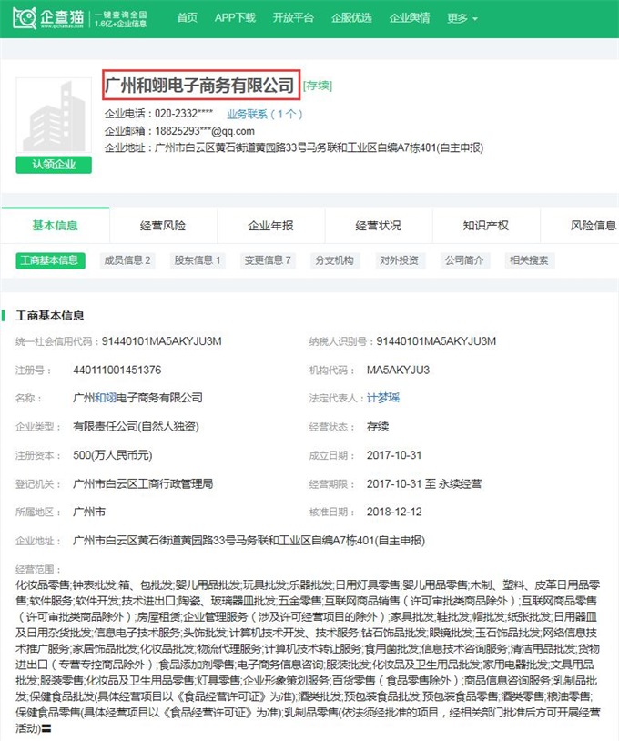 广州和翊电子商务有限公司成立于2017年10月31日,注册资本500万人民币,经营范围主要包括:化妆品零售;钟表批发;箱、包批发;婴儿用品批发;玩具批发;乐器批发;日用灯具零售;婴儿用品零售;木制、塑料、皮革日用品零售;软件服务;软件开发;技术进出口;陶瓷、玻璃器皿批发;五金零售;互联网商品销售等。
