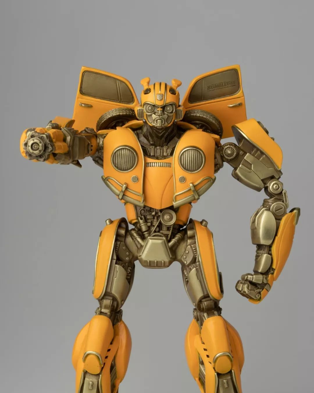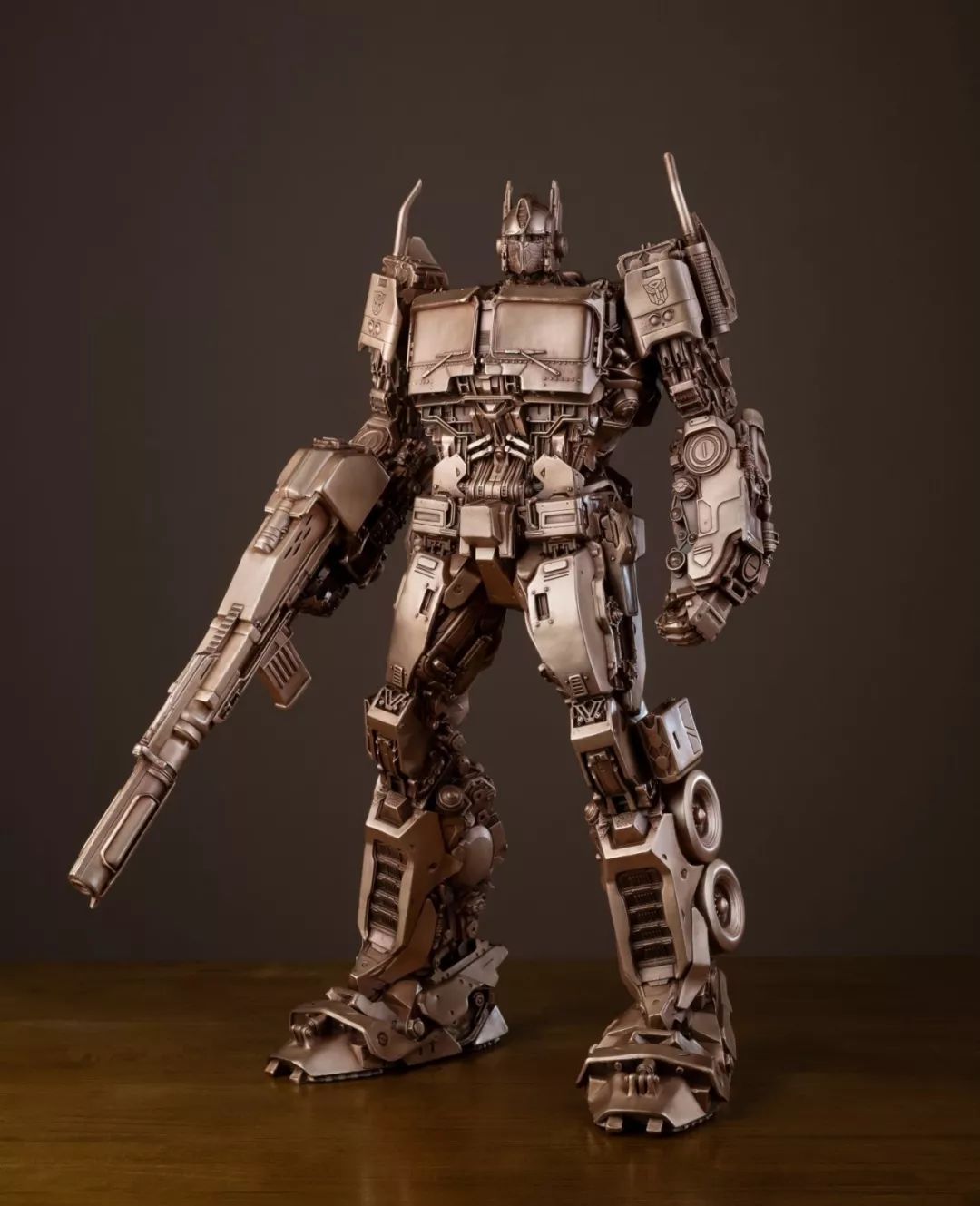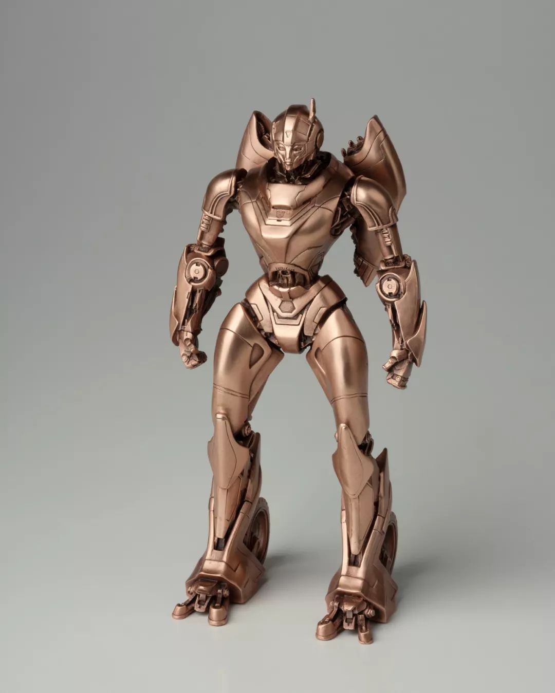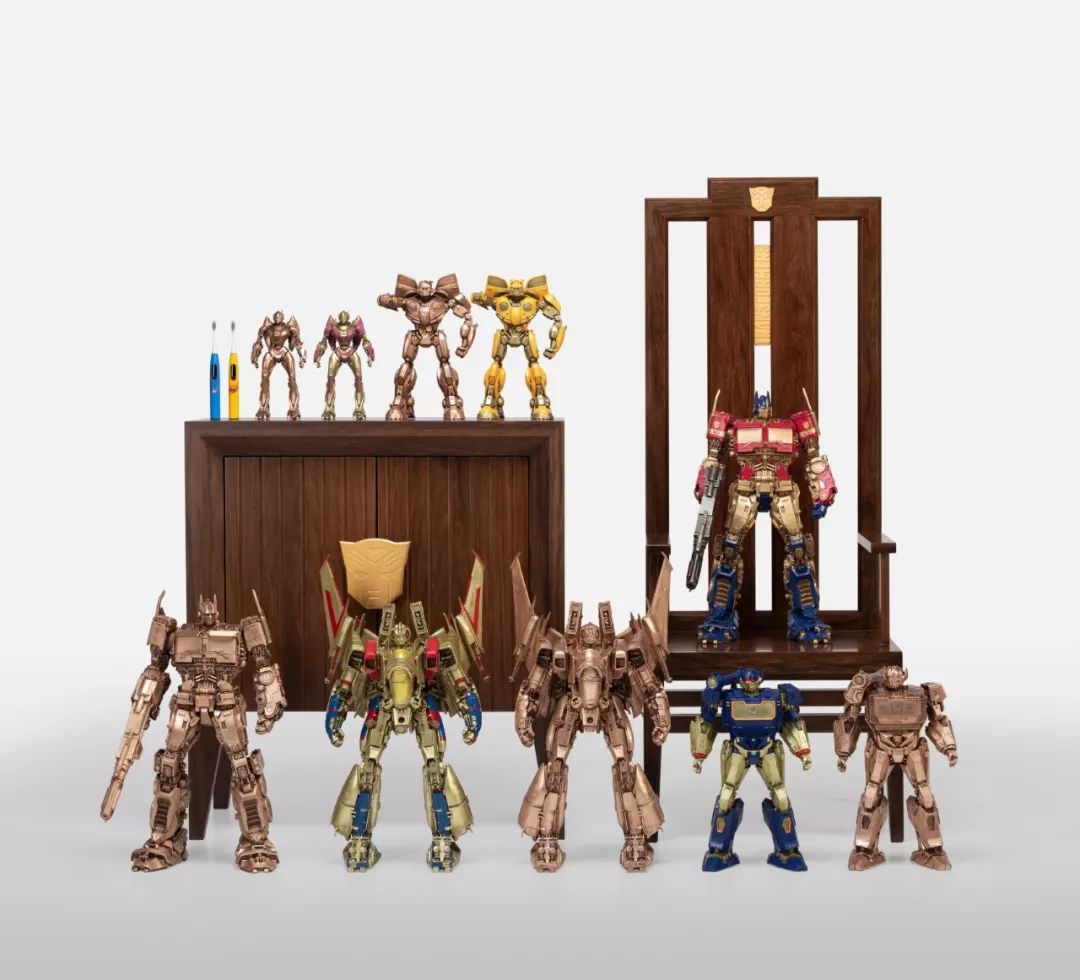 看完电影,我马上问孩之宝要了这批《大黄蜂》中的造型素材,立即布置雕塑团队开始开发,有了第一次的开发经验,这次相对顺利不少,擎天柱、大黄蜂、红蜘蛛、声波、阿尔茜,一个个铸造出来之后,我们团队自己也很喜欢,我们分别用青铜和黄铜都试制了样品,原打算只选一个版本,但是青铜和黄铜各有各的魅力,实在是割舍不下,同事说,都上吧,青铜成本高,限量。