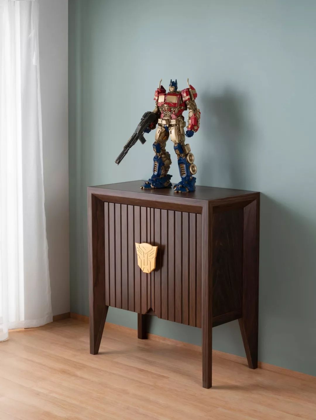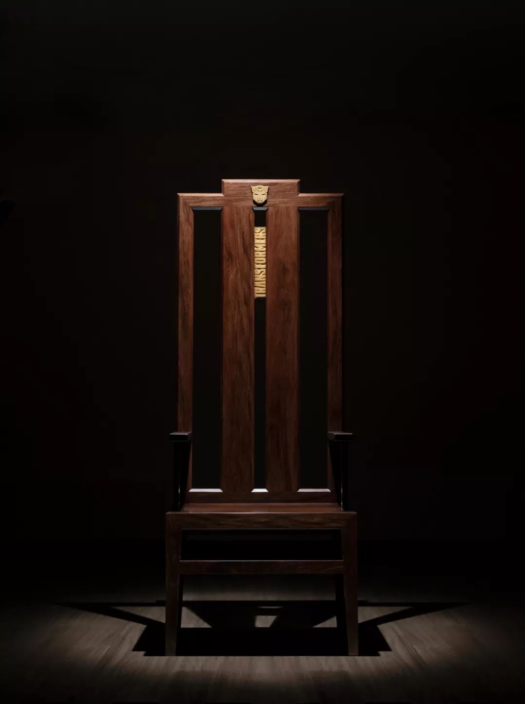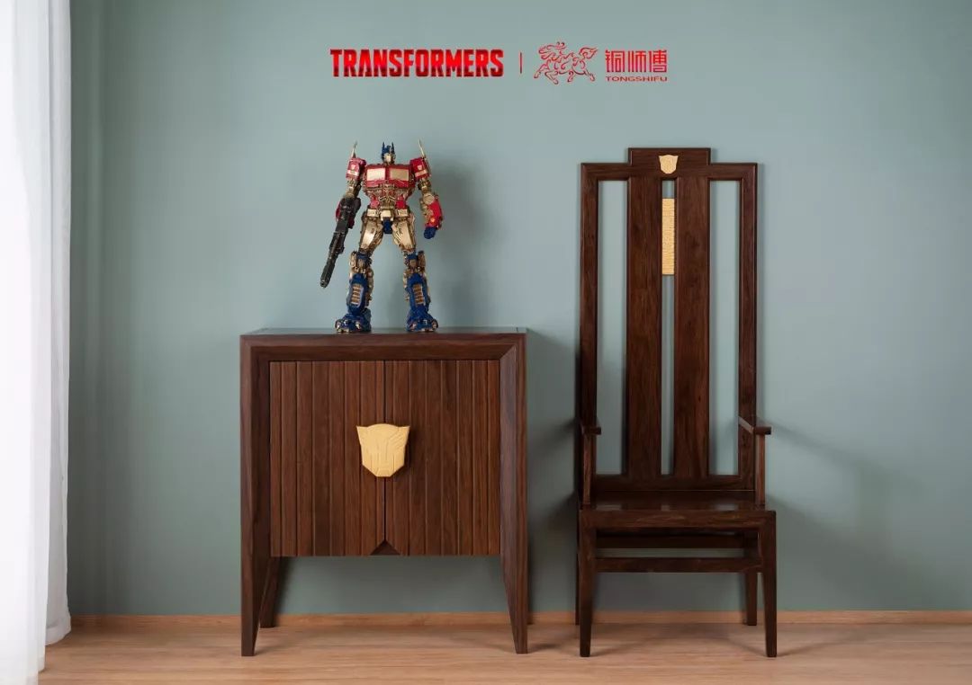 当初谈授权的时候,孩之宝说很喜欢中国文化,也很希望我们有机会可以将变形金刚元素和中国文化相结合,做出有意思的家具来,但我一直想不到很好的设计方案,就一直搁置着,这次众筹,我觉得无论如何,变形金刚家具要亮个相了,随手画了两个草图试试,把中国传统家具的设计元素和变形金刚的 汽车 人脸谱结合, 第二天就去车间打样,样品出来,厚重的大叶紫檀配上雍容华贵的真金鎏镀的铜饰,效果还蛮震撼,我把椅子取 名“首领椅”,和装饰柜一起发给孩之宝审核,孩之宝对这两件家具非常认可,认为这是东西方文化融合的一次很好的尝试,不过一把椅子净重38公斤,一个柜子则超过了80公斤,让我开始担心起快递费来。