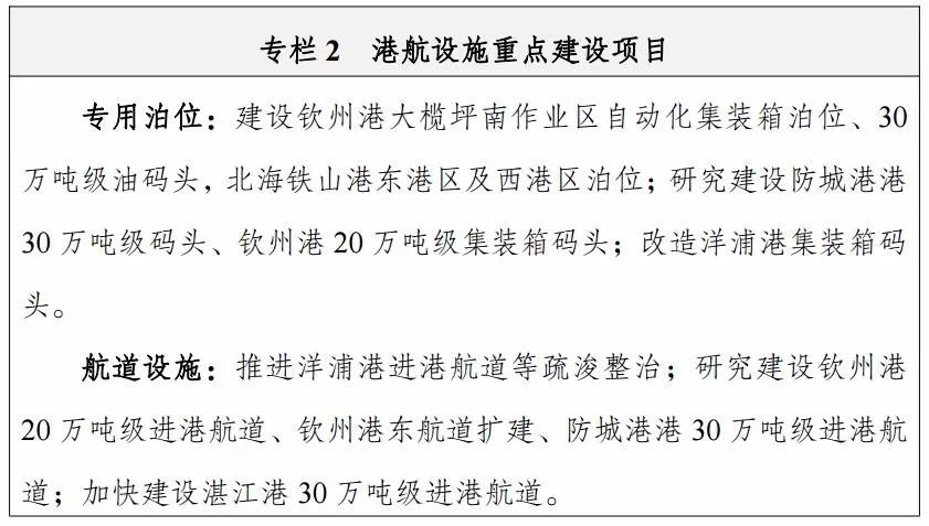 3、建设广西北部湾国际门户港,发挥海南洋浦的区域国际集装箱枢纽港作用,提升通道出海口功能。