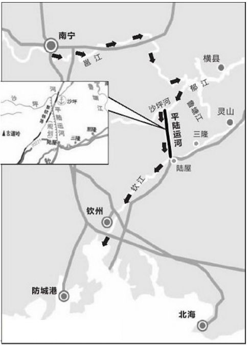 西江的一条主要支流是郁江,它流经南宁的一段叫邕江。所谓“平陆运河”,就是想把郁江和流经钦州的“钦江”两个水系连通,让3000吨的船可以从北部湾一直开到南宁市。