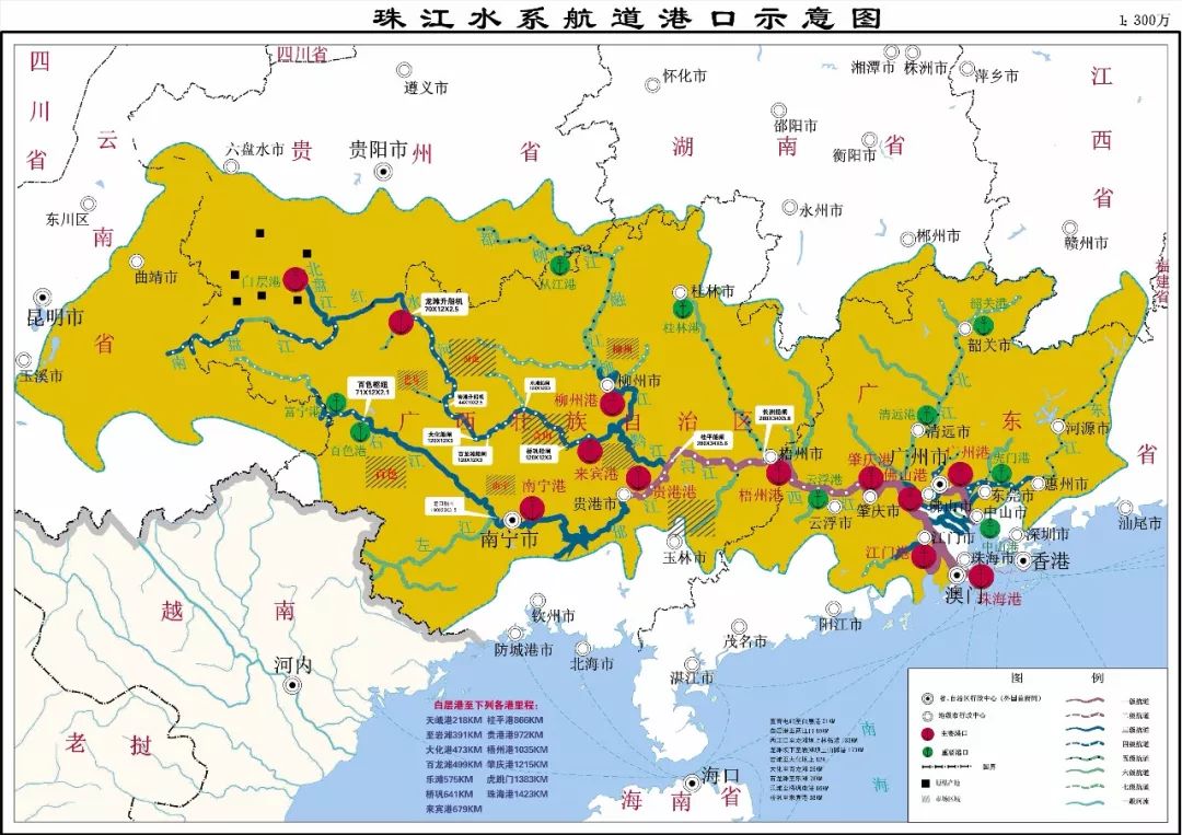 众所周知,珠江最大的支流是西江,而西江堪称广西的母亲河,但这个“母亲河”却选择了广东入海,让广西缺乏“内河航运+海运”的大通道。整个北部湾沿线港口跟西江不属于一个水系(见下图),广西的内河航运缺乏纵深。