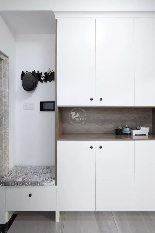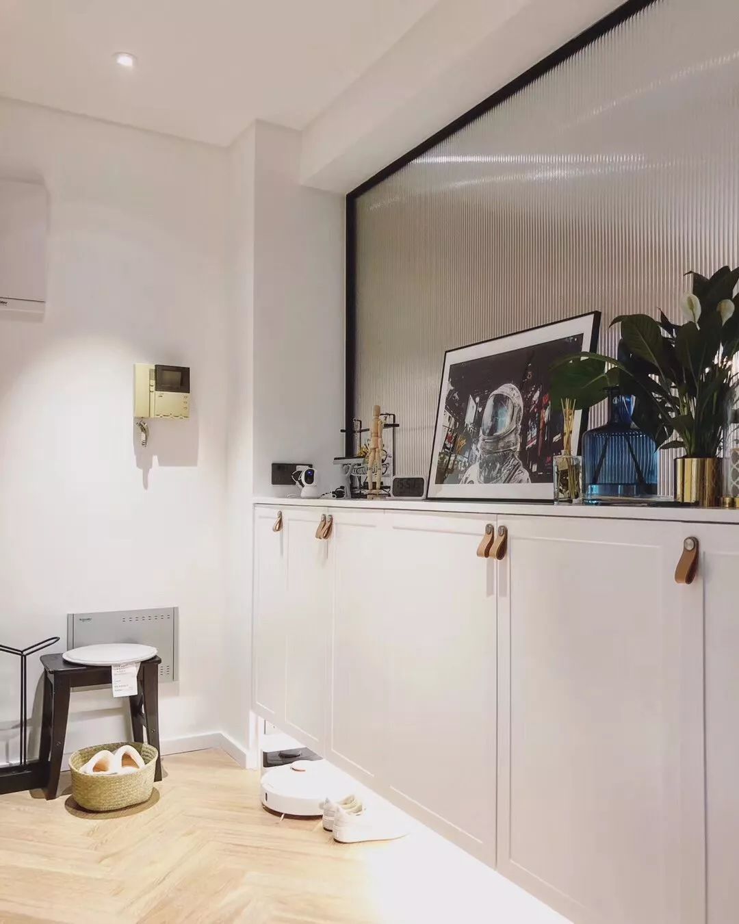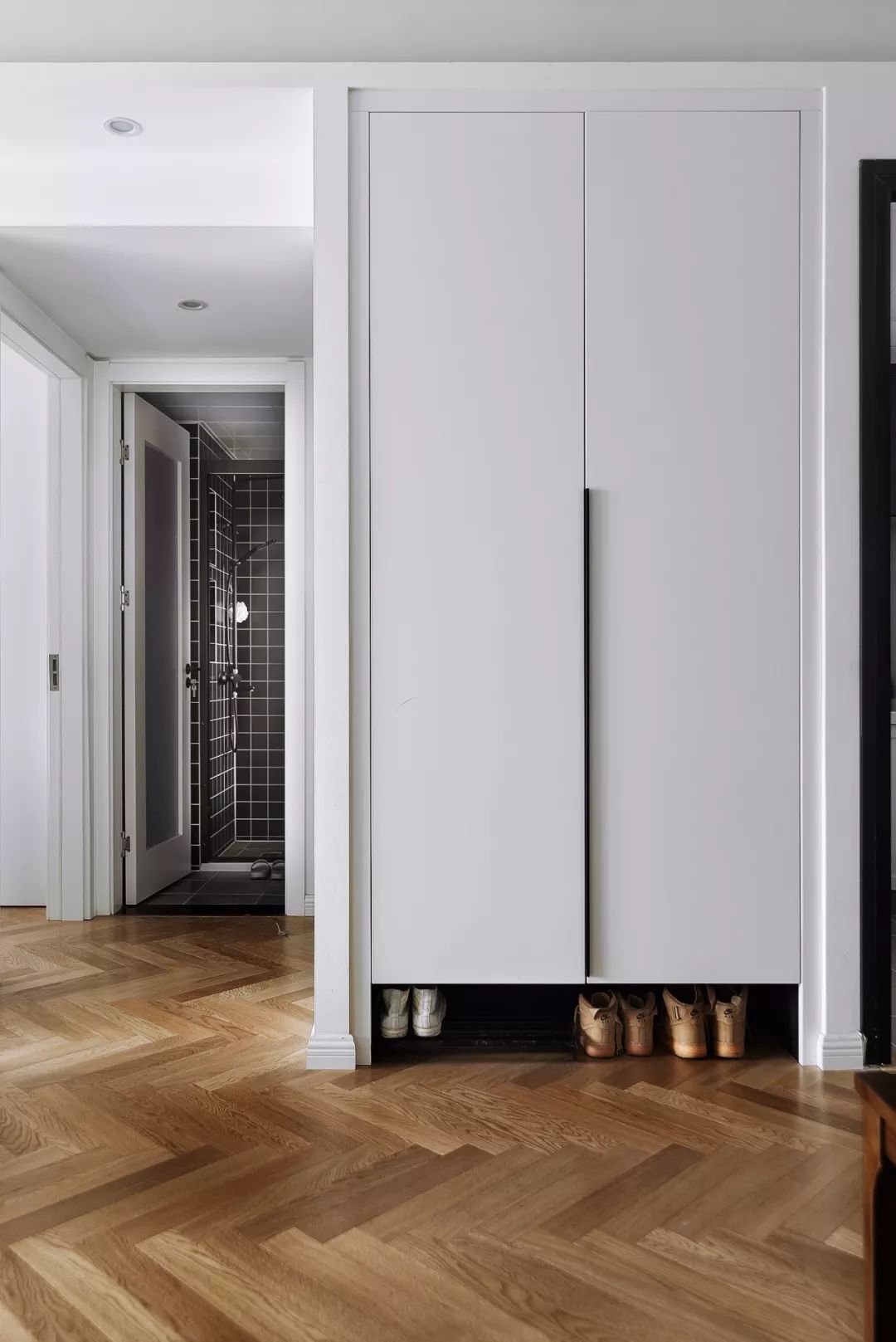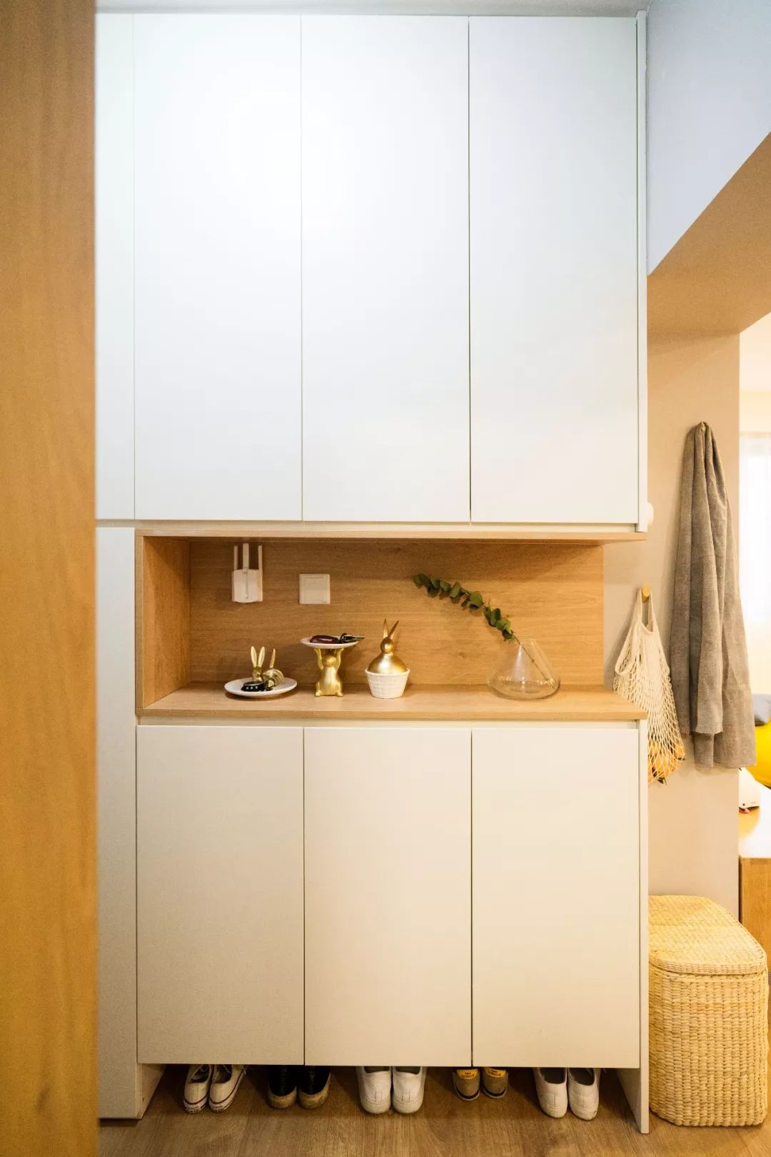 临时换下的鞋柜堵住门口太碍眼了!在鞋柜底部留空出一层,换下的鞋柜“随脚”给踢进去即可,保持进门空间的简洁美观,小小的设计心思,却能让生活更加轻松自然。