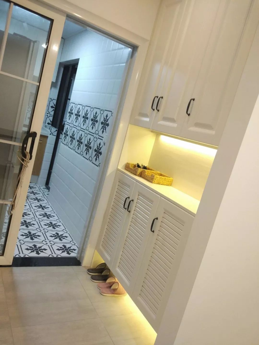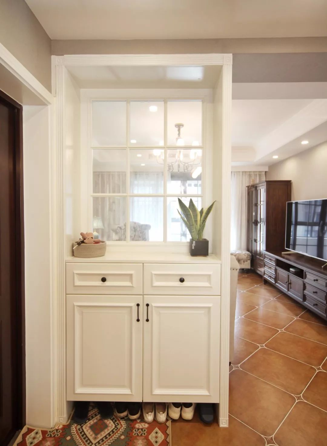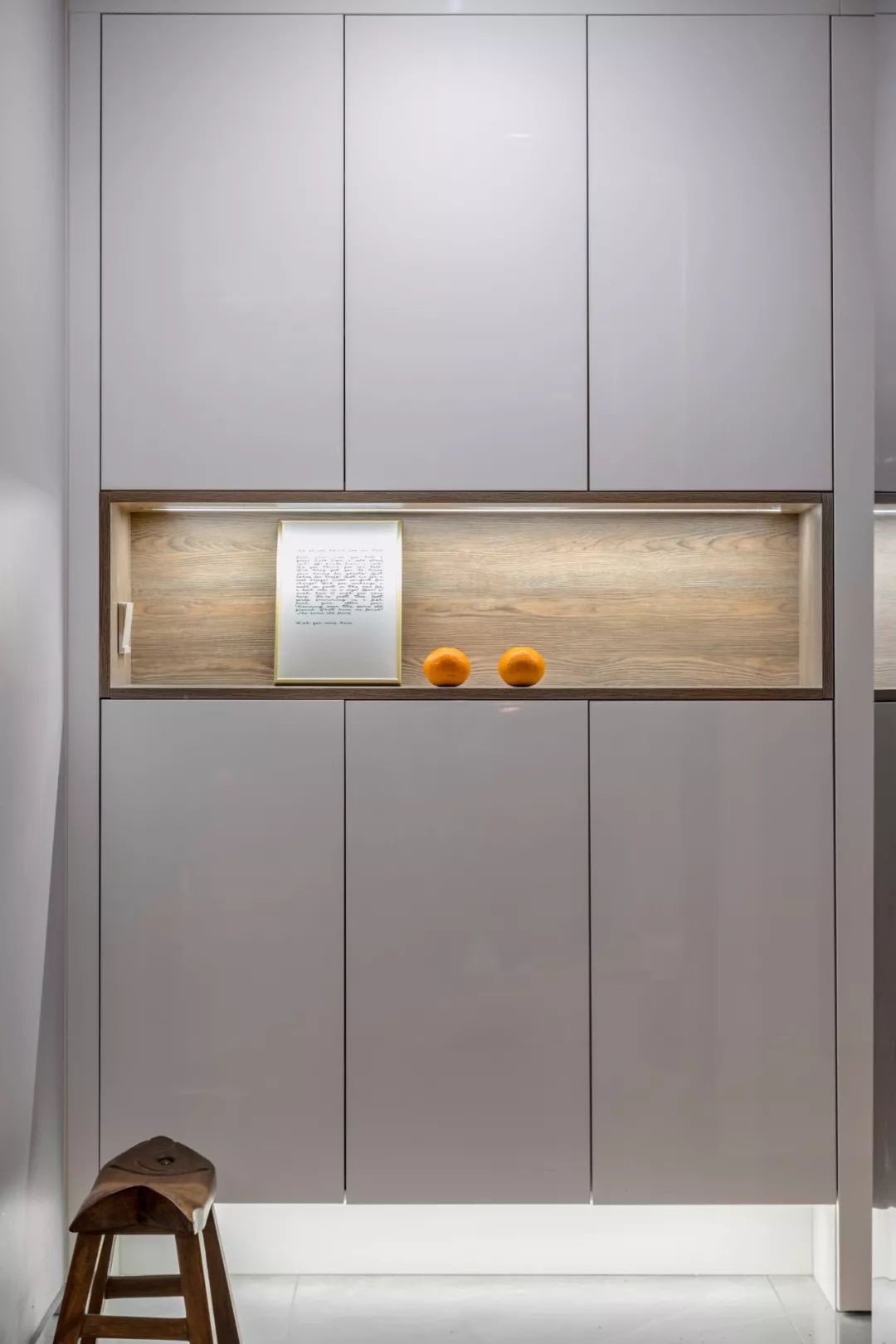 临时换下的鞋柜堵住门口太碍眼了!在鞋柜底部留空出一层,换下的鞋柜“随脚”给踢进去即可,保持进门空间的简洁美观,小小的设计心思,却能让生活更加轻松自然。