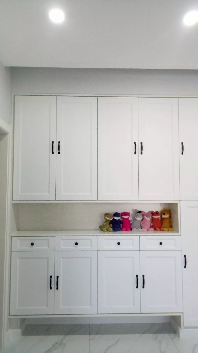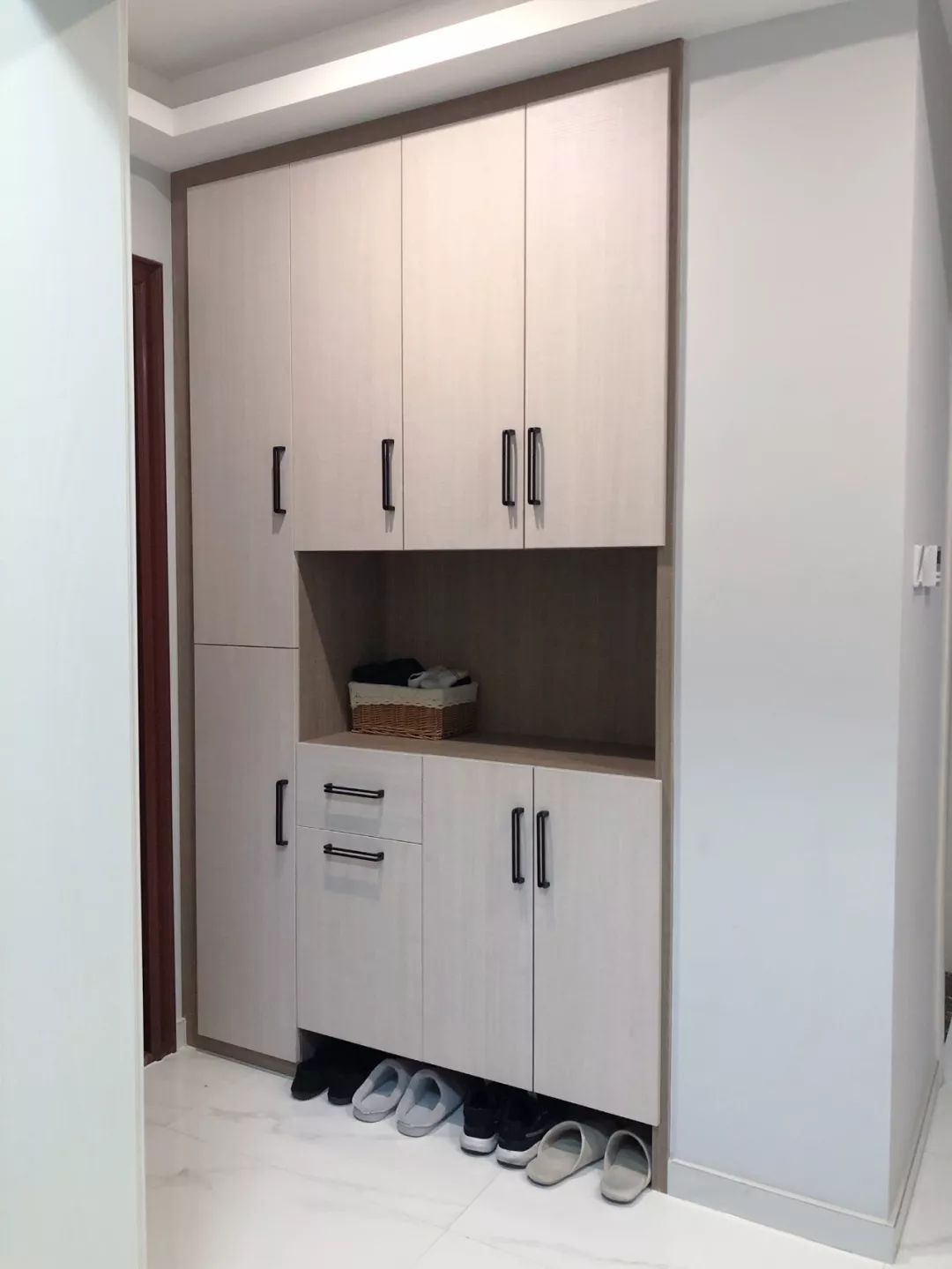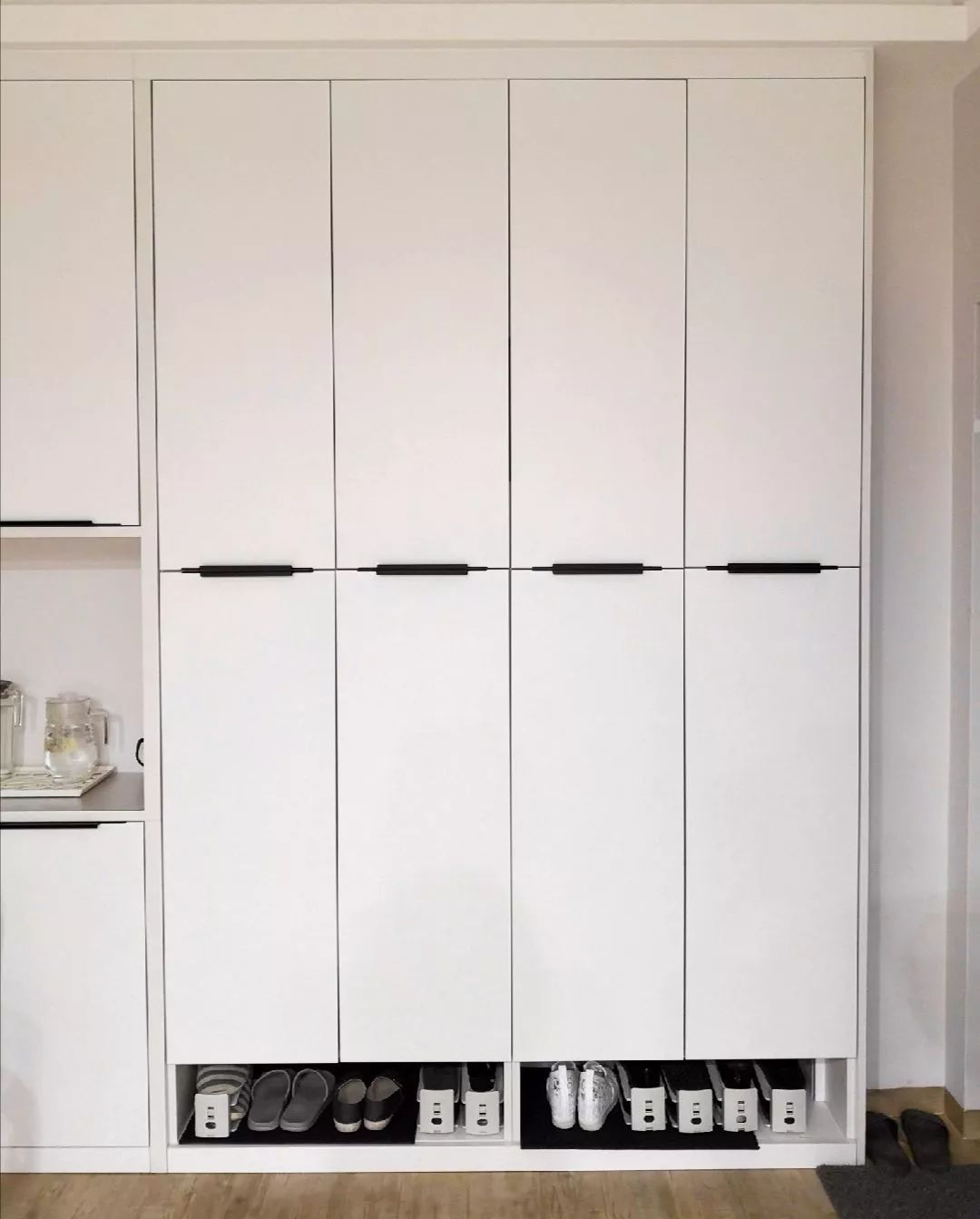 如果家里的人较多,那么居家拖鞋、临时外出拖鞋、上下班换的皮鞋或布鞋...,常换的鞋子多了,留空一层恐怕也是不够的,这个时候就可以考虑鞋柜底部的空间留空出多几个夹层,这样每次换鞋也不用打开柜门,保持玄关的简洁与舒适感。