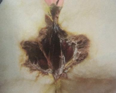 斑块可彼此相联,最后全果变腐烂。