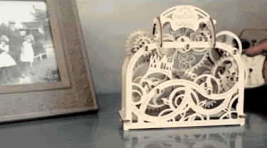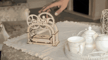 比如这个名片匣,提供61个部件,需要自己一点点组装起来,耗时约1~2小时。装配好了,转动齿轮,匣子会倾斜升起,盖子自动打开,用来放置名片或小物件,每次开启都伴随满满的仪式感。