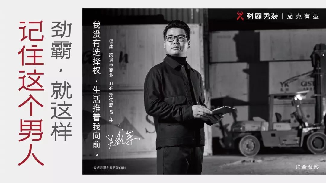 劲霸男装最近推出「记住这个男人」系列campaign,同时发布了广告片和系列平面广告,携手人像摄影师肖全,用真实的影像记录了全国 32 位各行各业的真实男性消费者。