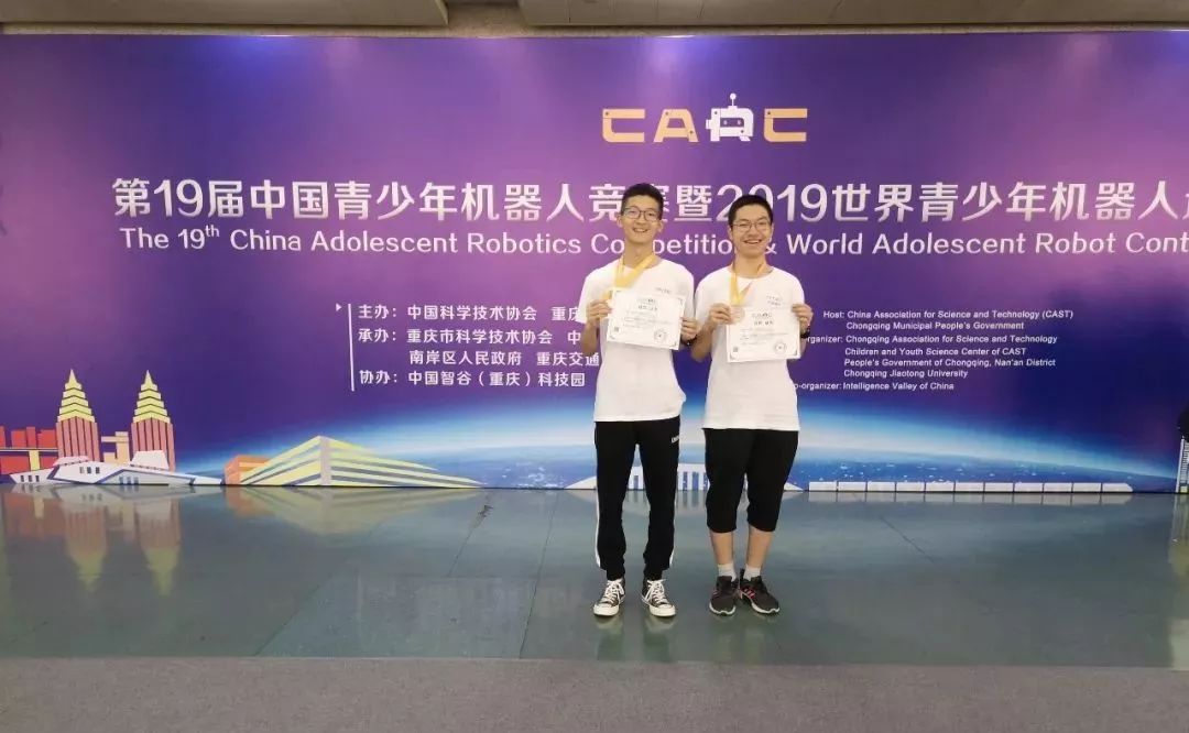 2019年8月16日,第19届中国青少年机器人竞赛暨2019世界青少年机器人邀请赛在重庆国际展览中心落下帷幕。哈三中沈雁鹏老师带领哈三中机器人竞赛团队的沙曜峤(群2.12)、戚壹焯(群1.17)同学参加了高中组综合技能项目的决赛,并以总分1427分的成绩获得银牌第二名。