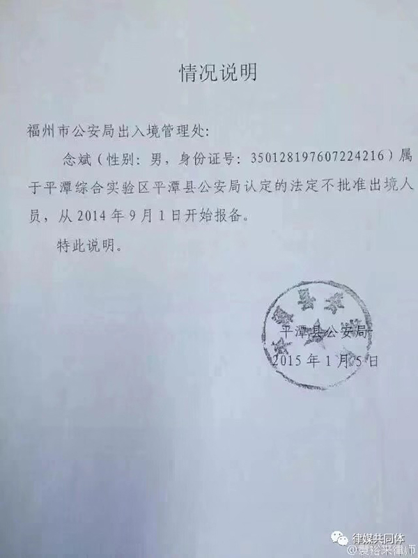 2015年1月,平潭县公安局提供的情况说明。受访者供图