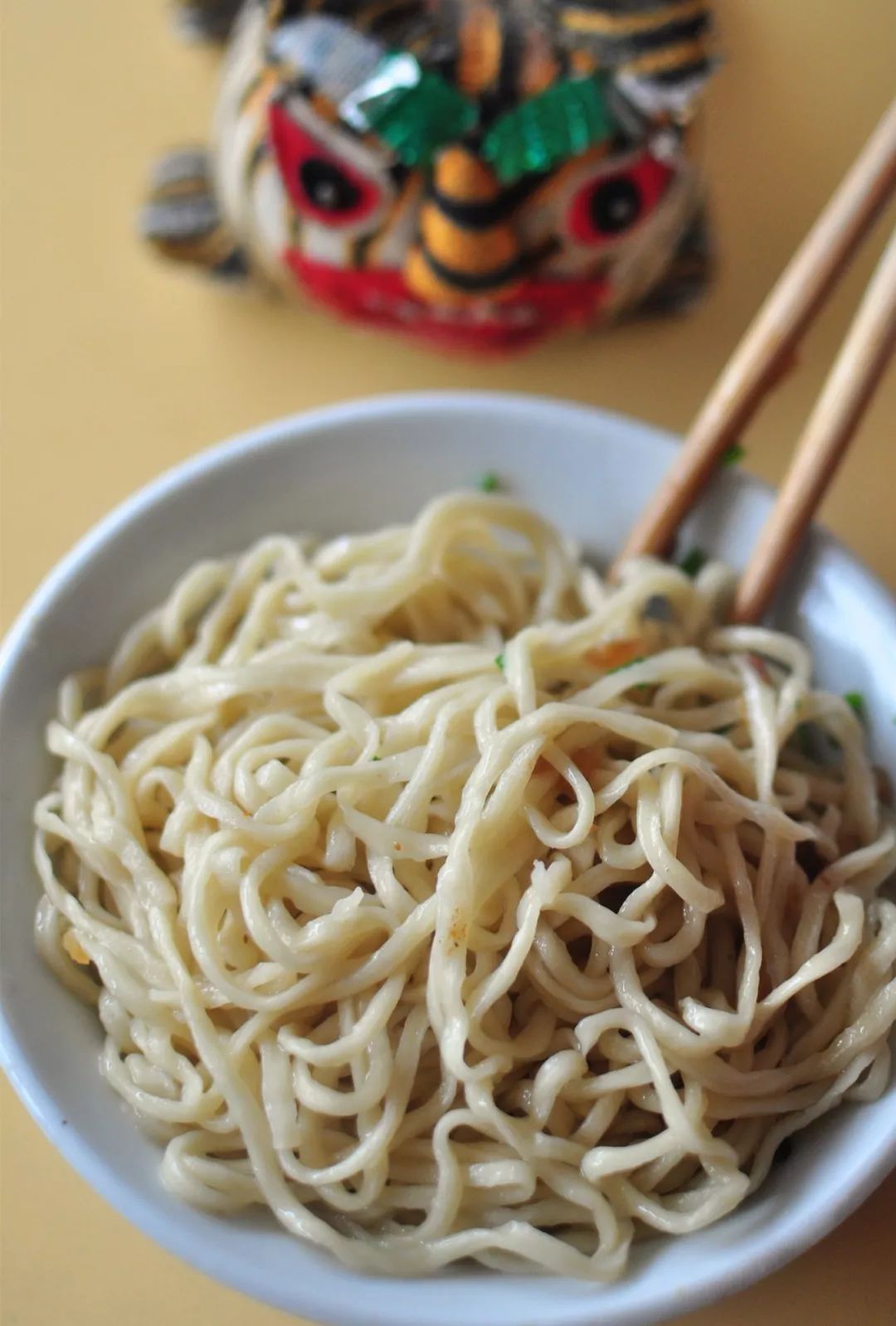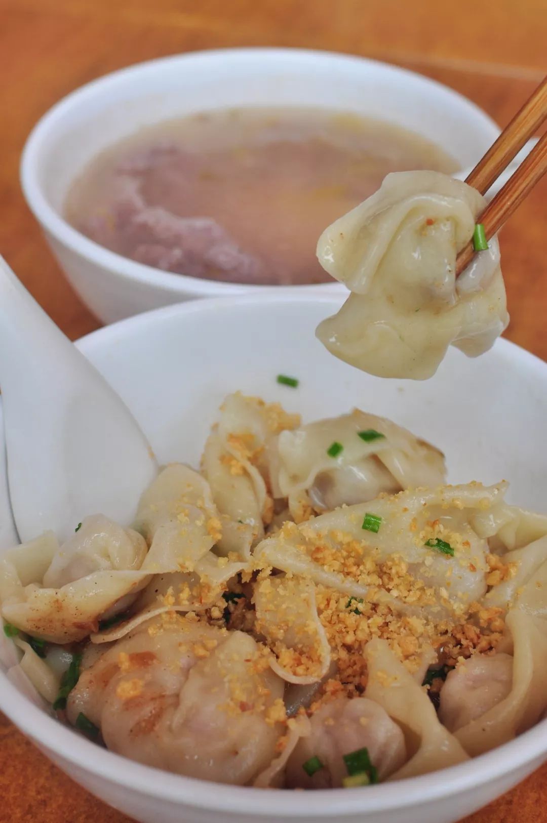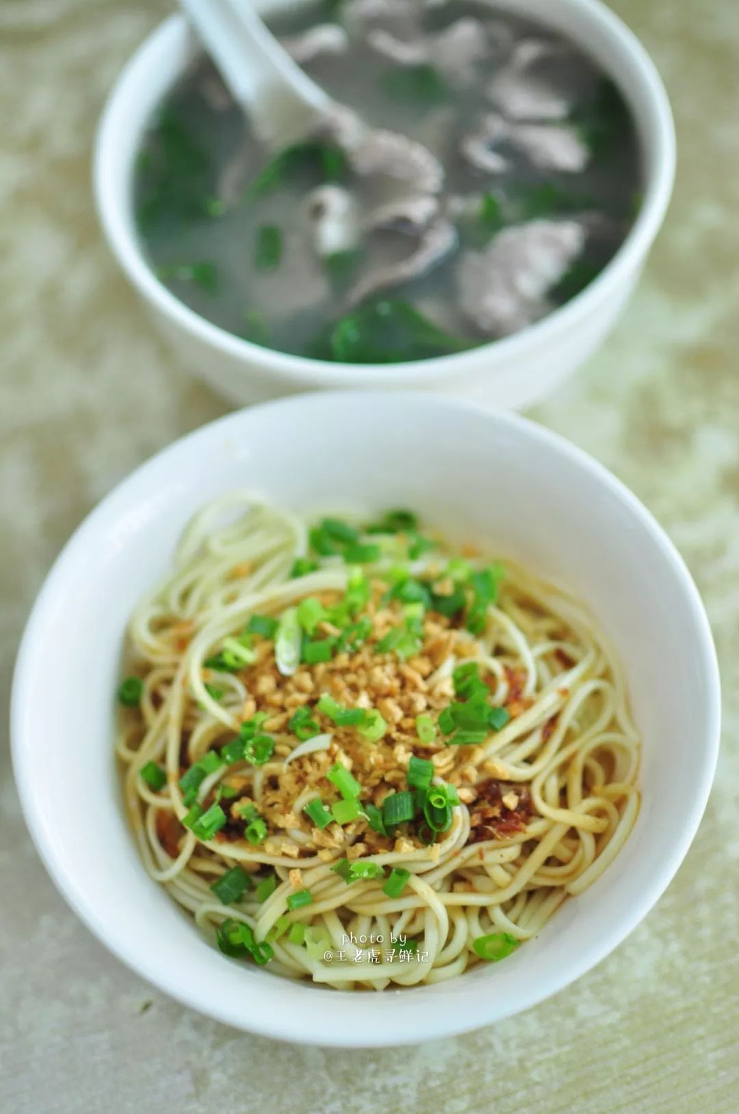 一碗手擀的细且韧的碱面,在沸水锅中滚上几滚,便轻盈的漂浮起来,热气腾腾的弥漫着麦香和水气。一只瓷碗,碗中早就淋了一勺熬好的鲜美的鱼露,一勺热沸的葱猪油兜头泼上,刺啦声中,鱼露的鲜香便喷薄而出了,这葱猪油必须要是现炸的才够香够靓呀,炸油的猪板油要够厚够肥,葱呢,要用大葱的葱白还要再加一些干葱头来炸,单一的葱味是不够香的。而且一定要用热油把碗里的鱼露的味儿“激”出来,腌面的“味儿”才够正。