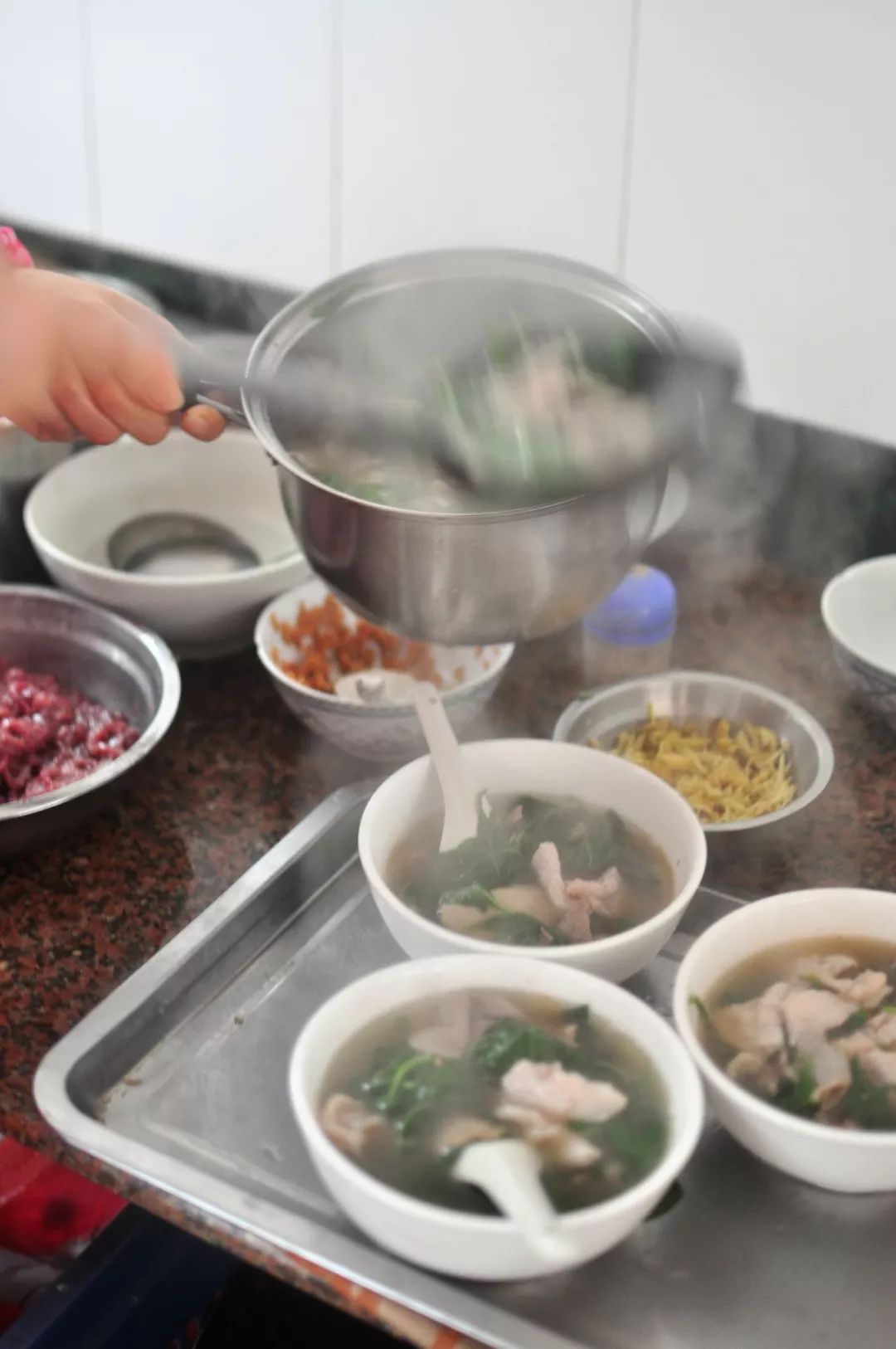 吃这腌面的标配,是一碗猪杂汤。汤一般的是三及第汤,有生烫的猪瘦肉片猪肝片还有粉肠三样,在科举取仕时代,状元、榜眼、探花为殿试头三名,合称三及第。后人用猪肝、瘦肉、粉肠等三种食材比作三及第,三及第汤由此而得名。五及第汤呢,多了猪心片和猪腰片,最好的是六及第汤,比五及第汤又多了一份猪生肠。