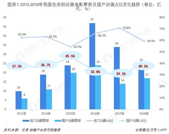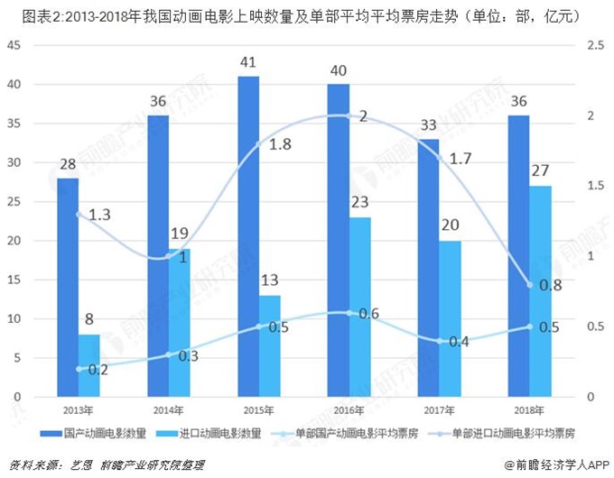 2013-2018年国内动画电影市场年均上映影片数量达54部,其中,国产动画电影的年均上映数量约36部,进口动画电影约18部,其在数量上远远低于国产动画电影。