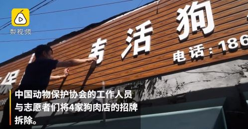 2019年8月22日,在“男女当街捕狗被人肉”事件之后,辽宁沈阳狗肉一条街,4家狗肉店相继关门。中国动物保护协会的工作人员与志愿者们经狗肉店老板同意,将这4家狗肉店的招牌拆除,并贴上“拒食猫狗”的海报。
