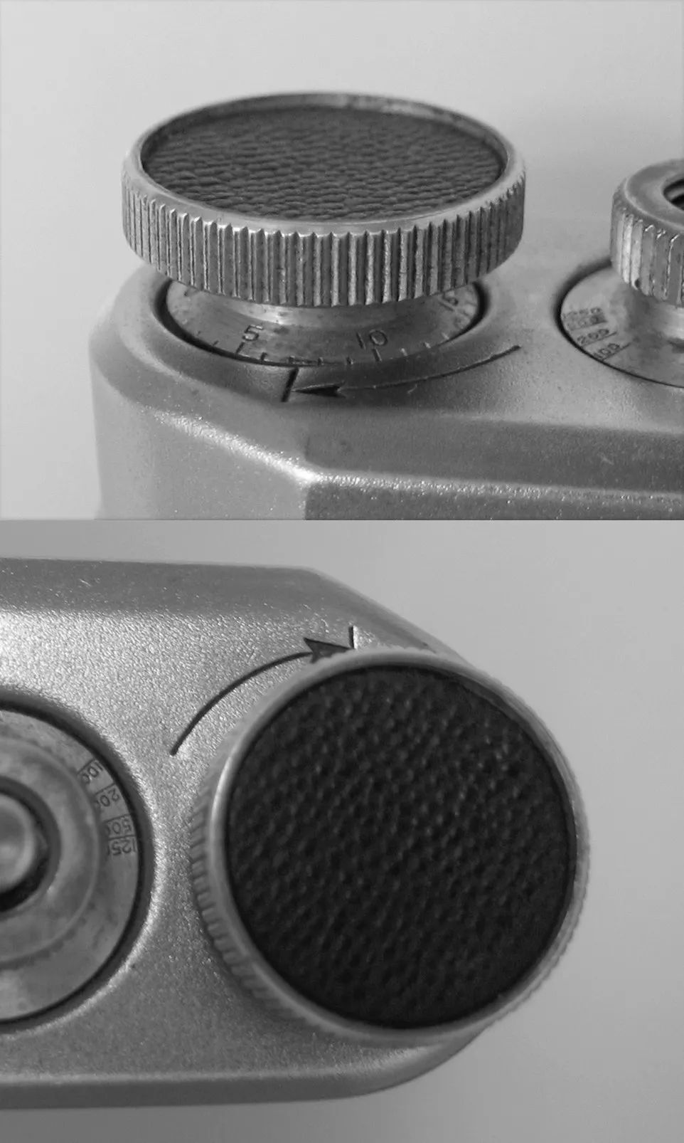 单就做工而言,Perfex de Luxe 相机似乎不及 Perfex 55。不过,其输片和回片手轮使用了更为经典的可拔起“瓶盖式”,较下端锥形的“礼帽式”手感更好,拔起输片手轮计数器归零的设计比拨盘式归零结构更稳定,缺点是计数器被手轮遮挡,查看拍摄张数时不如以前方便(图14)。