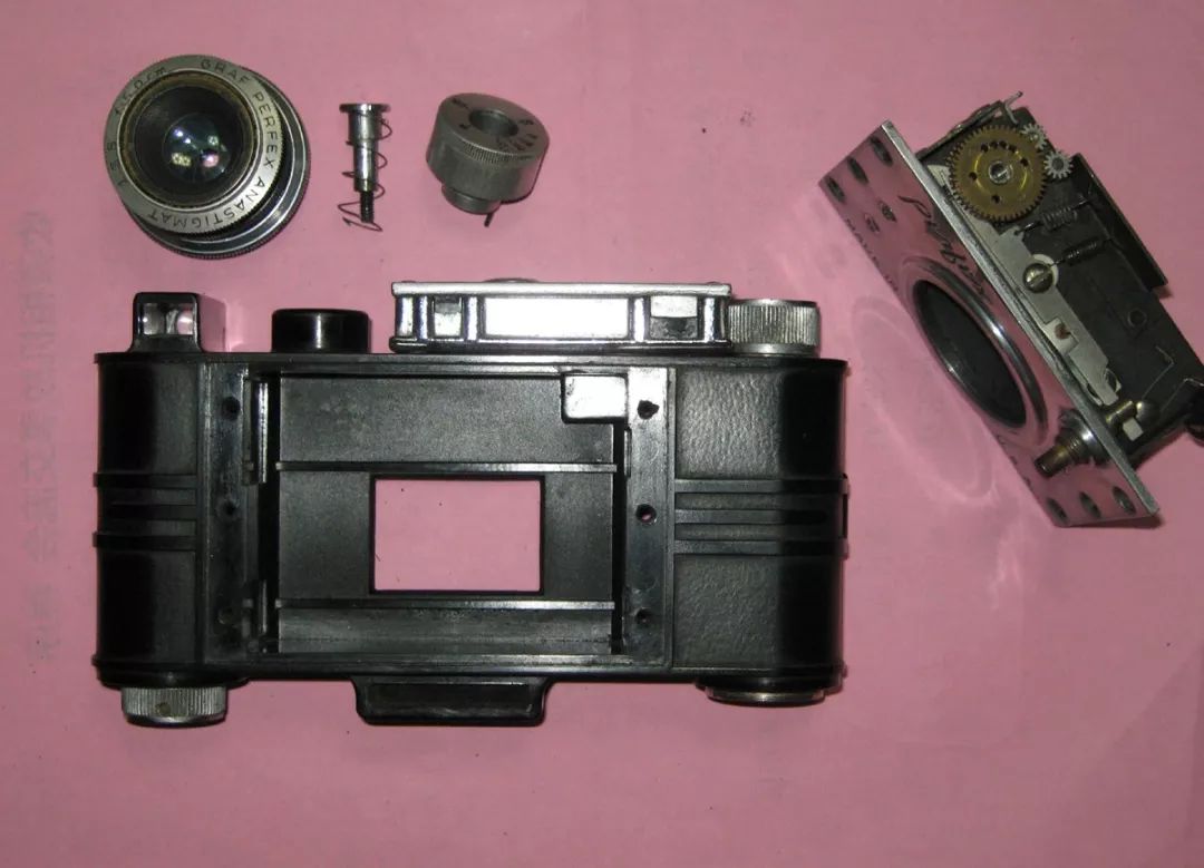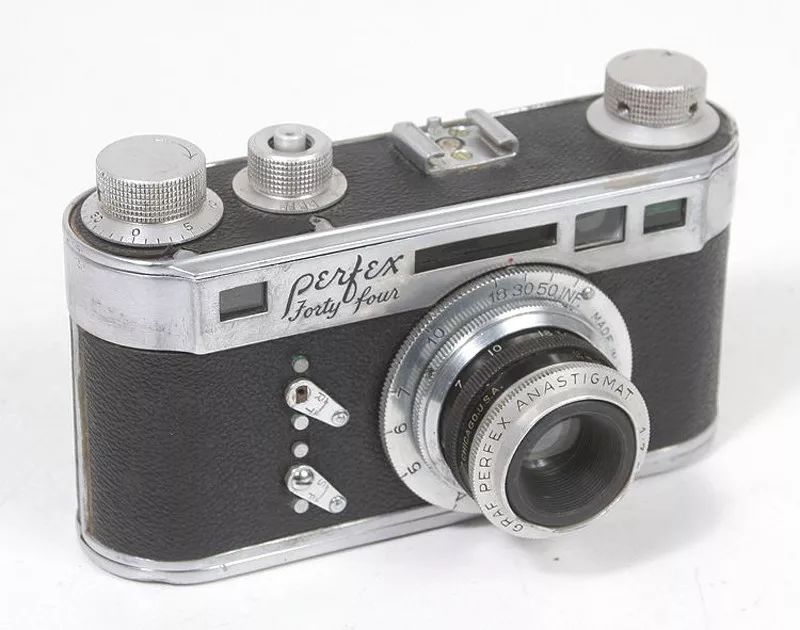1939 年,该公司发表了 Perfex 44 相机(图07),材料改为铸铝,表面贴皮,边角有镀铬边条,将光学测光表位置由原先的底部移到了相机前面的上方,和取景、测焦窗并列,更加简洁。