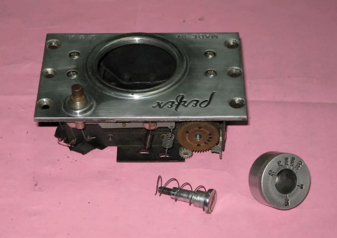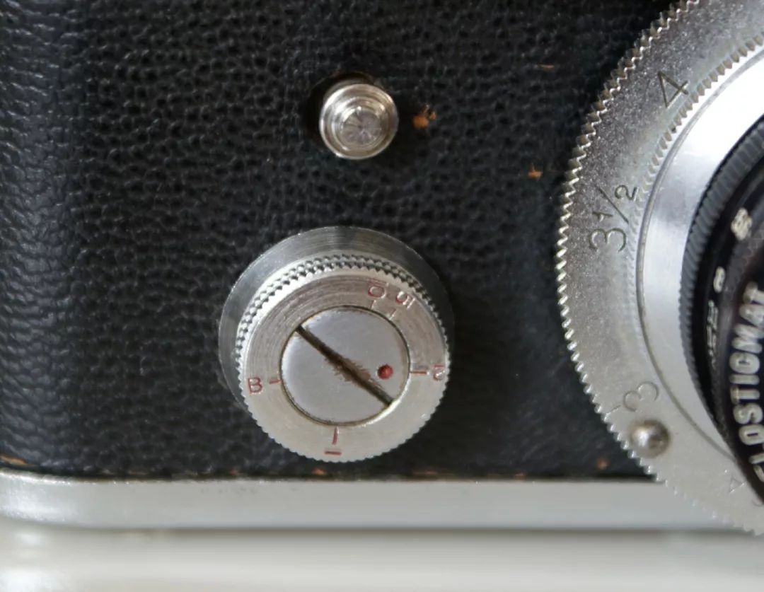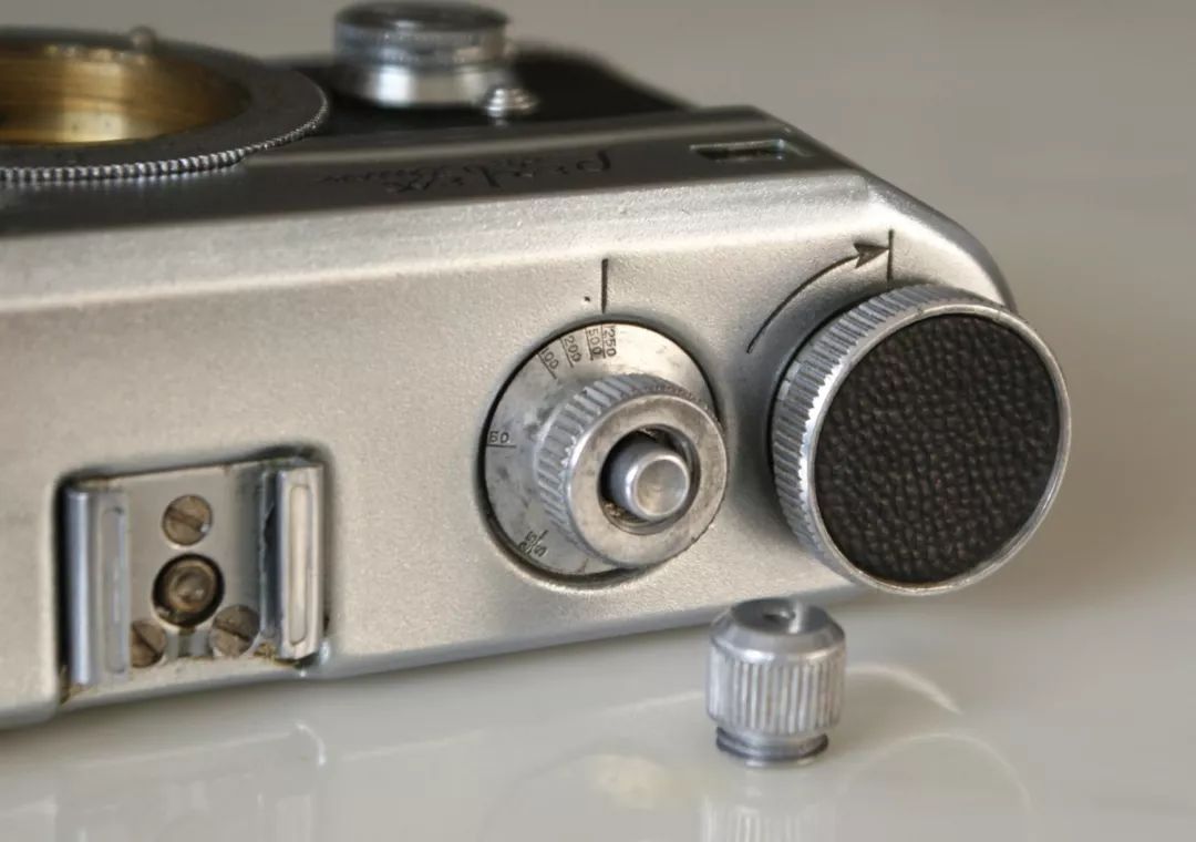 Perfex de Luxe 相机的快/慢门采用分立结构,快门位于相机上方的输片轮一侧,拔起式调节,共 6 挡:1/25、1/50、1/100、1/200、1/500和1/1250(秒);