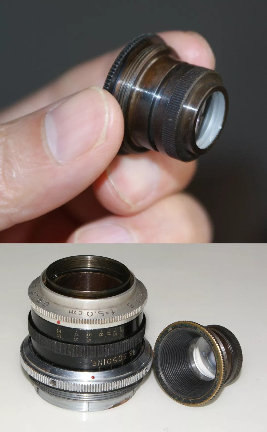 以标注为 5CM F3.5 的镜头为例,无镀膜、正光结构(对球差、彗差、像散、畸变、场曲、色差这 6 种像差都能进行校正的摄影镜头结构被称为正光结构——编者注)、11叶高精度彩虹光圈。