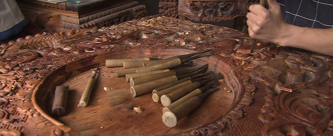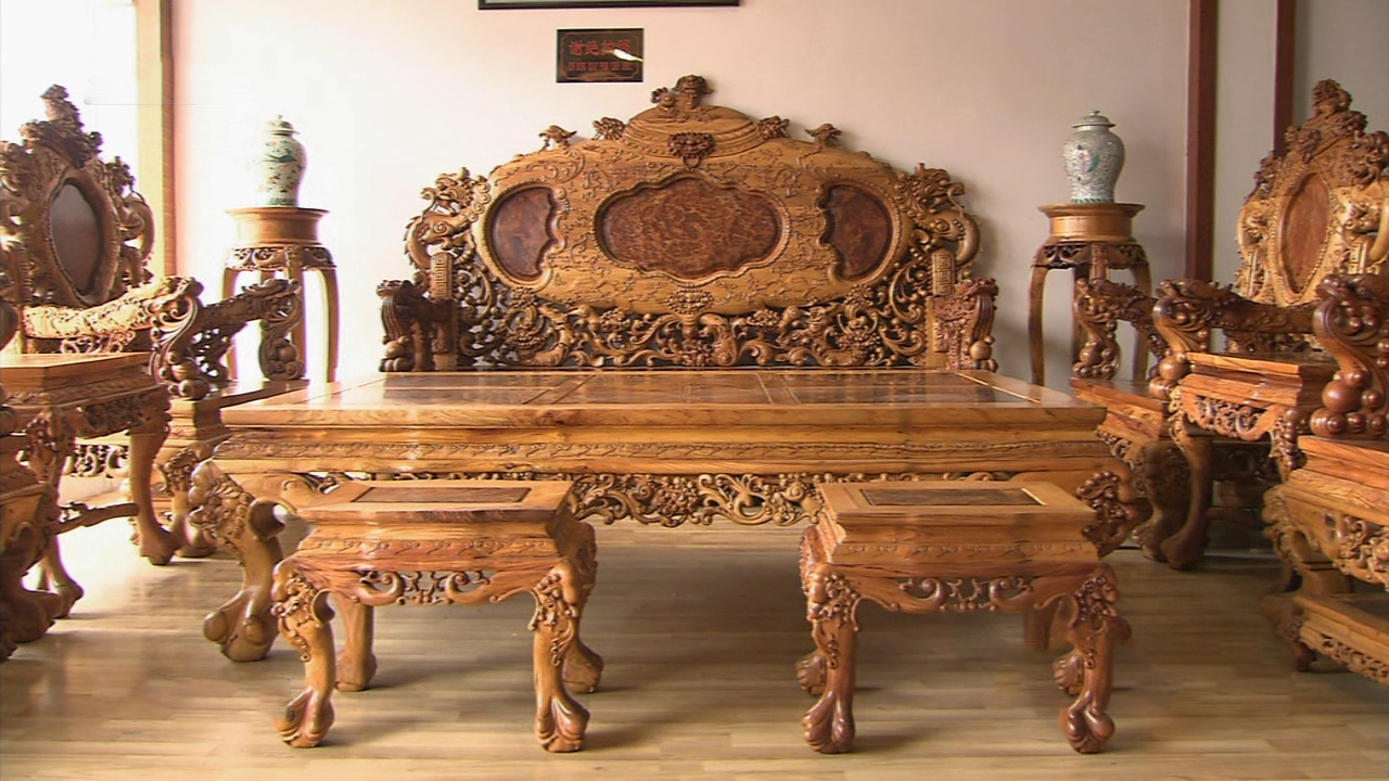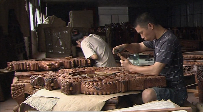 在凭祥做红木生意的商户,很多都是采用前店后厂的模式经营。看过如此精美的红木家具,我们对它的加工过程产生了兴趣。浙江东阳雕刻师傅,正在雕刻的这套黄花梨宝鼎,需要8吨原料,从8年前就开始选料。