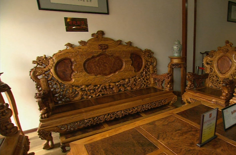我们眼前这套红木沙发名字叫做龙凤呈祥黄花梨大宝鼎,价值1.2亿。全套沙发一共17件,其中三人大沙发高度有182厘米,长265厘米,尺寸之大,市面少见,整套沙发将传统的龙凤图案雕刻其中,听店主说制作这套沙发的材料是从10吨越南黄花梨中精选而出,40多位工匠历时三年,耗时6000多个工时,精心雕琢而成,整套沙发雕工精巧,图案逼真,没有经过任何油漆工艺,完全靠反复打磨上蜡,让家具本身透出平滑、润泽的光彩。除了尺寸超大,做工精细之外,这套沙发的一大特点,就在于靠背、茶几、面板等部位,选用了具有天然奇异花纹的花梨瘿木搭配制作而成,瘿木也就是树瘤,剖面花纹呈山水、人物、鸟兽状,极为漂亮。花梨木的树瘤因数量稀少,价格昂贵,平常也难得一见。