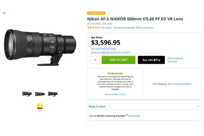 DPReview也向尼康美国询问缺货是否是由每月1000支的低产量导致,厂方回复道:“AF-S 500mm f/5.6E PF ED VR 的预订量远超我们的预期。我们将会尽快完成订单,并感谢客户的耐心等待”,并未正面回复产量的问题,但是也没有否认1000支/月的传闻。