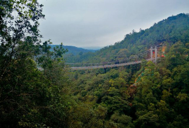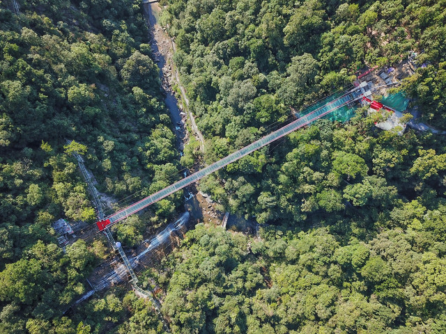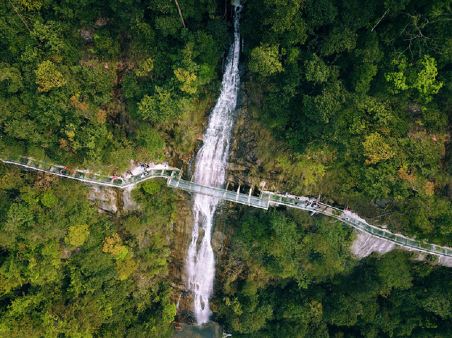 九龙江玻璃桥也是网红打卡点,矗立于巍峨绝壁,穿越飞龙瀑布,截断漫山云雨,栈桥共长800米,悬于120米高空之上。人行于桥上,可将林莽沧浪尽收眼底,可谓“人在云端走,景在脚底游”。