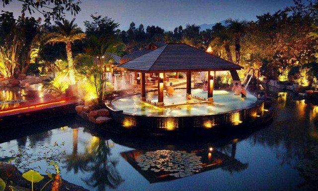 夜幕悄悄降临,灯光缓缓亮起,山庄被热泉水蒸气笼罩着,如梦似幻,宛若天空仙境。白日里是环境优美的度假山庄,入夜后变成了另一个奇幻世界。