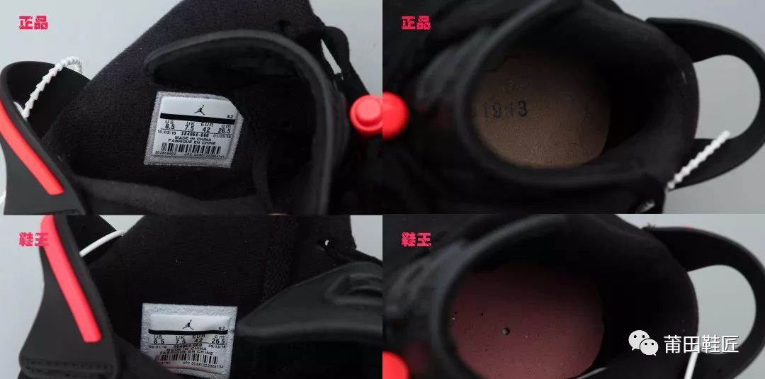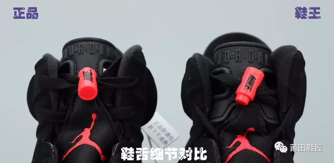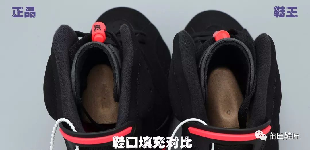 黑色鞋舌饰有红色刺绣飞人,而标志性的鞋带锁扣则印有元年版的NIKE字样,经典的复古氛围更强烈。从对比图中可以看出,正品的鞋带与鞋匠的鞋带锁扣方向是相反的,所以字也颠倒了。从鞋口的细节看,两个鞋口的形状是一样的,里面的海绵填充物也非常柔软和厚实。