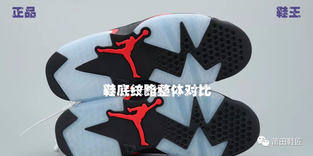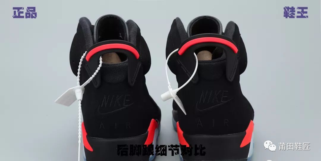 Nike Air的鞋跟配备的鞋提在红线的装饰下,视觉效果更富张力。中间是一个模糊的刺绣Jumpman Air标志。整个鞋跟看起来很挺拔,两双鞋的鞋跟看起来几乎一样。鞋底的水晶蓝看起来很透彻,纹路都一致,但正品的鞋子的颜色比鞋匠的颜色亮。